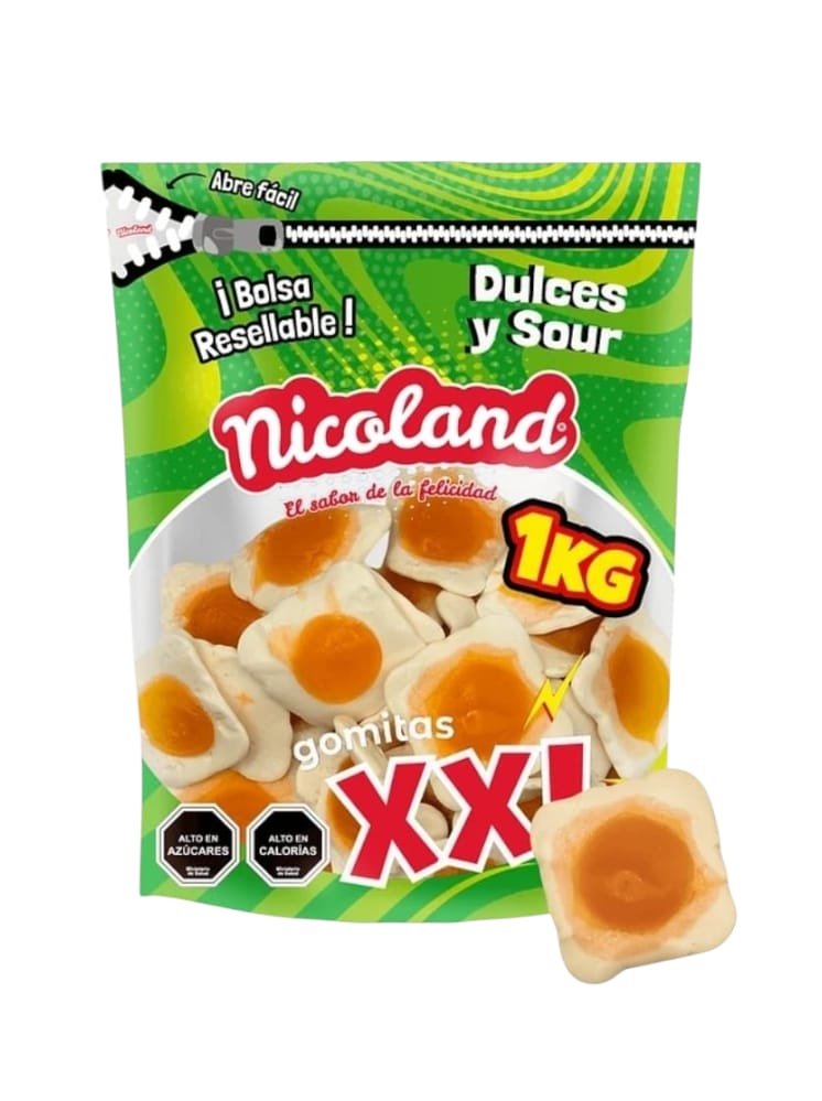 ¿Buscas una gomita original y deliciosa? Las Gomitas XXL Huevo Frito Nicoland son la opción más innovadora y sabrosa. Cada bolsa contiene 1 kilogramo de gomitas con la divertida forma de huevo frito, combinando una textura suave y un sabor espectacularmente Dulce y Sour.