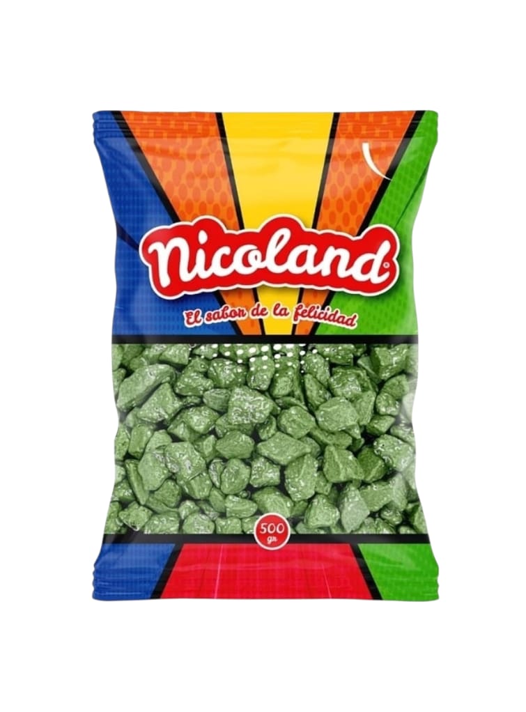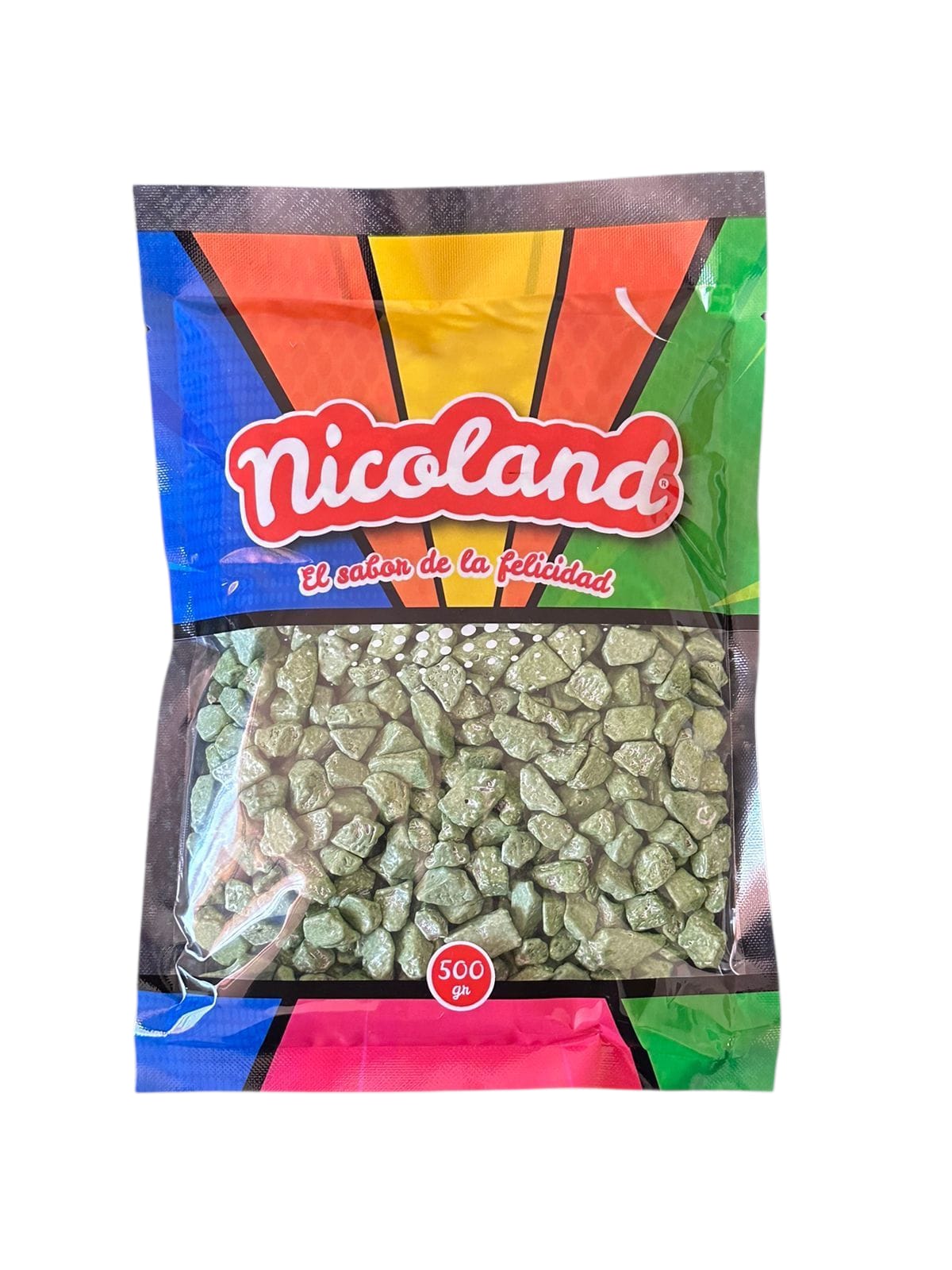 Estas irresistibles piedras verdes combinan el sabor intenso del chocolate con una cobertura crujiente de colores verdes, creando una textura única y divertida que sorprende en cada bocado.
